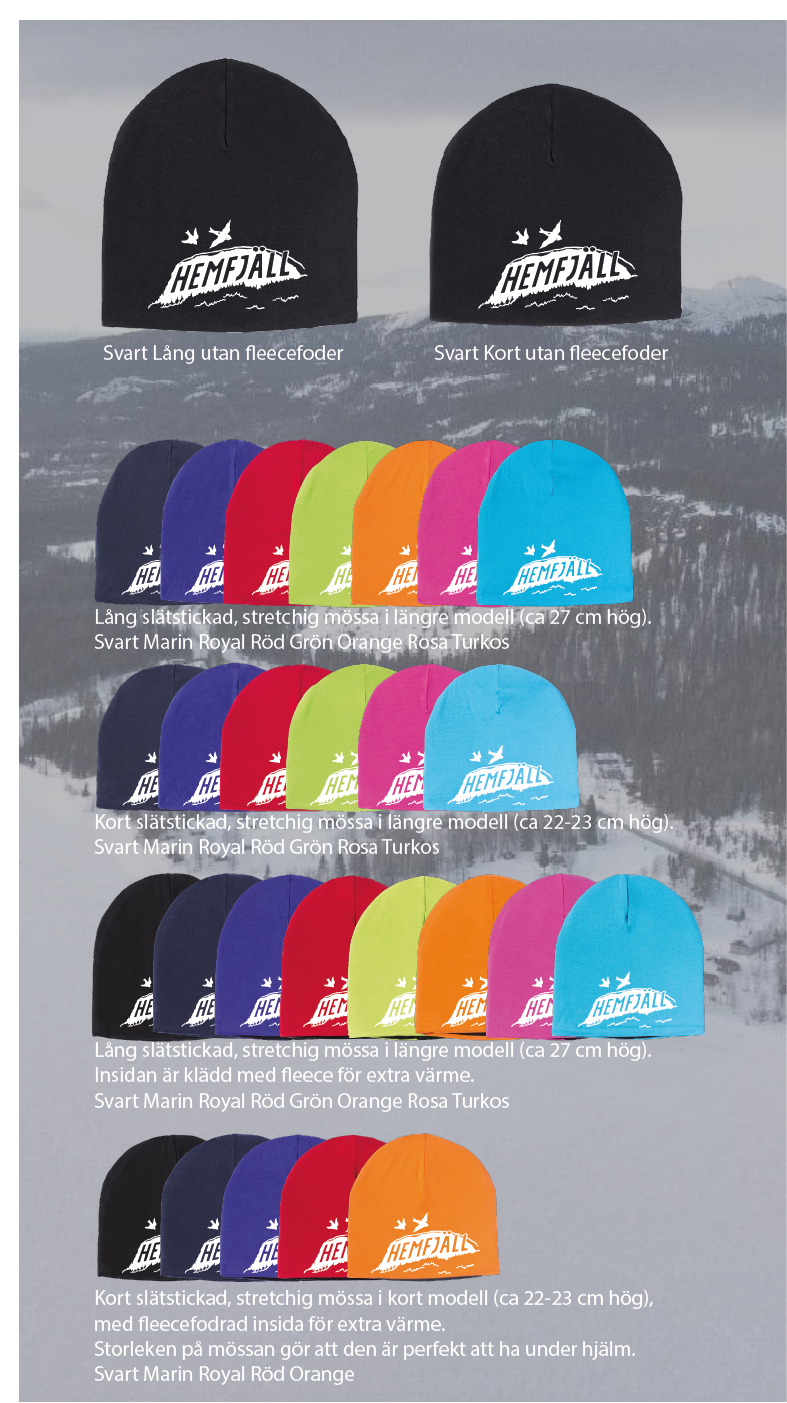 Slätstickad, stretchig mössa i kort (ca 22-23 cm hög). eller lång modell (ca 27 cm hög). Finns även med fleece klädd insida för extra värme.